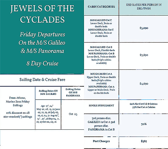 Meals: Buffet breakfast and 1 meal daily, including a Welcome Cocktail, a Greek night Evening, fun BBQ (weather permitting), and Captain’s Dinner