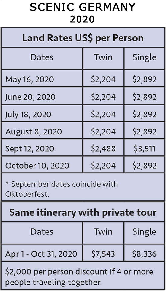 After breakfast, we travel to Munich. Tour the city’s main sights followed by a free afternoon. Tonight, enjoy a traditional Bavarian dinner. Overnight in Munich (B)