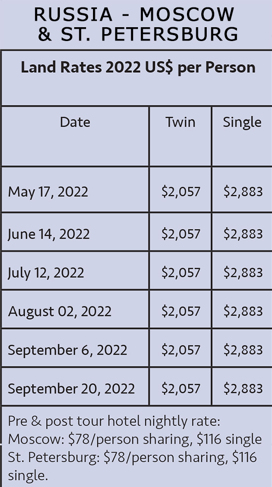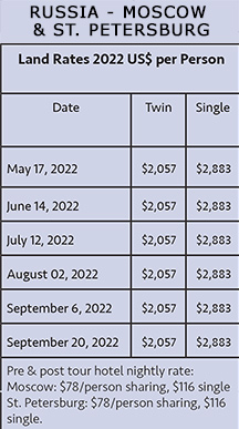 The world’s largest country offers a lot to see and experience. The treasures of the Russian Tsars now in world famous museums, palaces, gardens and modern day vibrant cities are waiting for you. This six night escorted tour is the perfect way to explore Moscow and St. Petersburg.